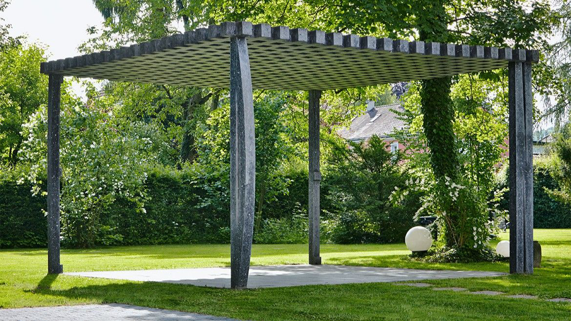 Der verwendete schwarze Beton bildet einen bewussten Kontrast zum Grün des Parks. Er wirkt weder kalt noch schwer – vielmehr erscheint er durch die filigrane Ausführung fast schwebend. Das durchbrochene Dach lässt Licht und Schatten durchfluten und erzeugt ein lebendiges Spiel auf dem Boden – wie Sonnenstrahlen, die durch ein Blätterdach tanzen.