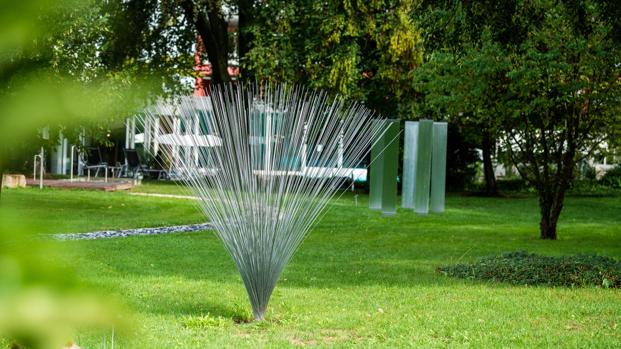 Neben dem Pavillon finden sich im Park seit 2017 auch filigrane Federstahl-Skulpturen der Schweizer Künstler Daniel Meili und Bruno Loetscher. Die Skulpturen interagieren mit Licht, Wind und Umgebung – genau wie der Pavillon selbst. Gemeinsam schaffen die Kunstwerke eine Schnittstelle zwischen Kunst, Natur und Mensch, die selten so harmonisch gelingt.